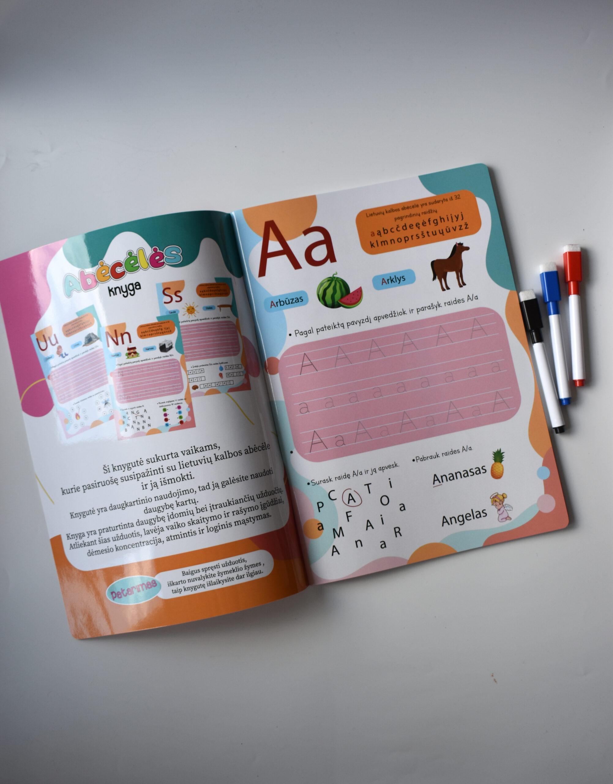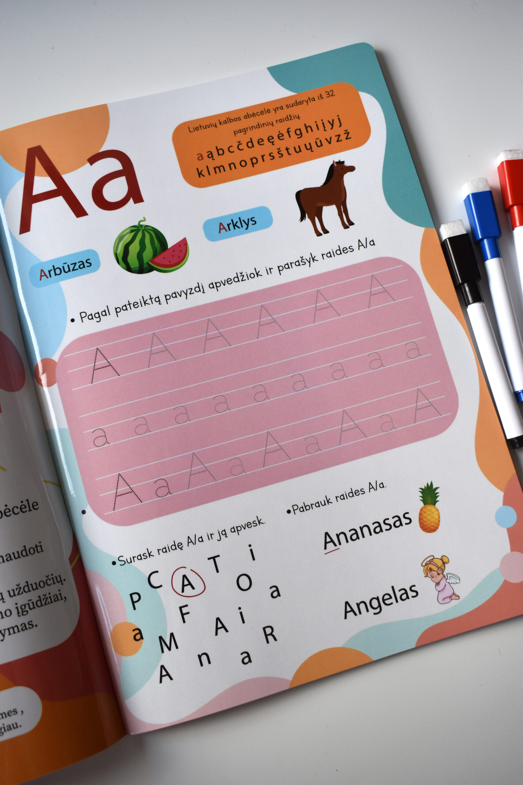 Atraskite smagų ir praktišką būdą mokytis lietuvių kalbos raidžių! Ši daugkartinio naudojimo abėcėlės knygutė vaikams – puiki edukacinė priemonė, skirta ugdyti raidžių pažinimą ir lavinti svarbius įgūdžius.Ši daugkartinė užduočių knygelė padeda vaikams pažinti visas 32 lietuvių kalbos abėcėlės raides ir lavinti smulkiąją motoriką, dėmesį bei loginį mąstymą. Kadangi tai daugkartinė mokomoji knygutė, vaikai gali rašyti, trinti ir kartoti užduotis neribotą skaičių kartų, dėl to mokymasis tampa efektyvesnis ir įdomesnis su šia užduočių knygute.