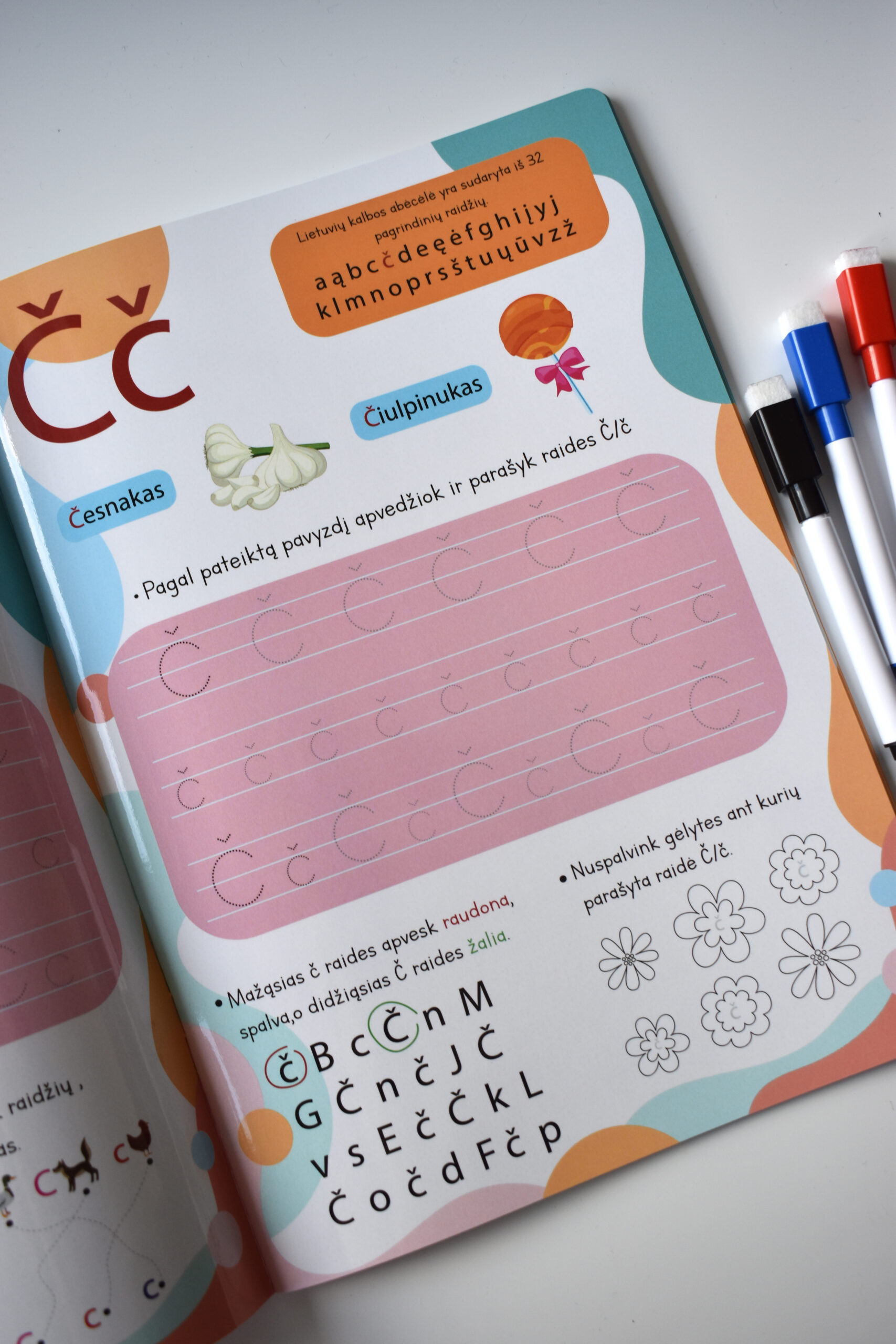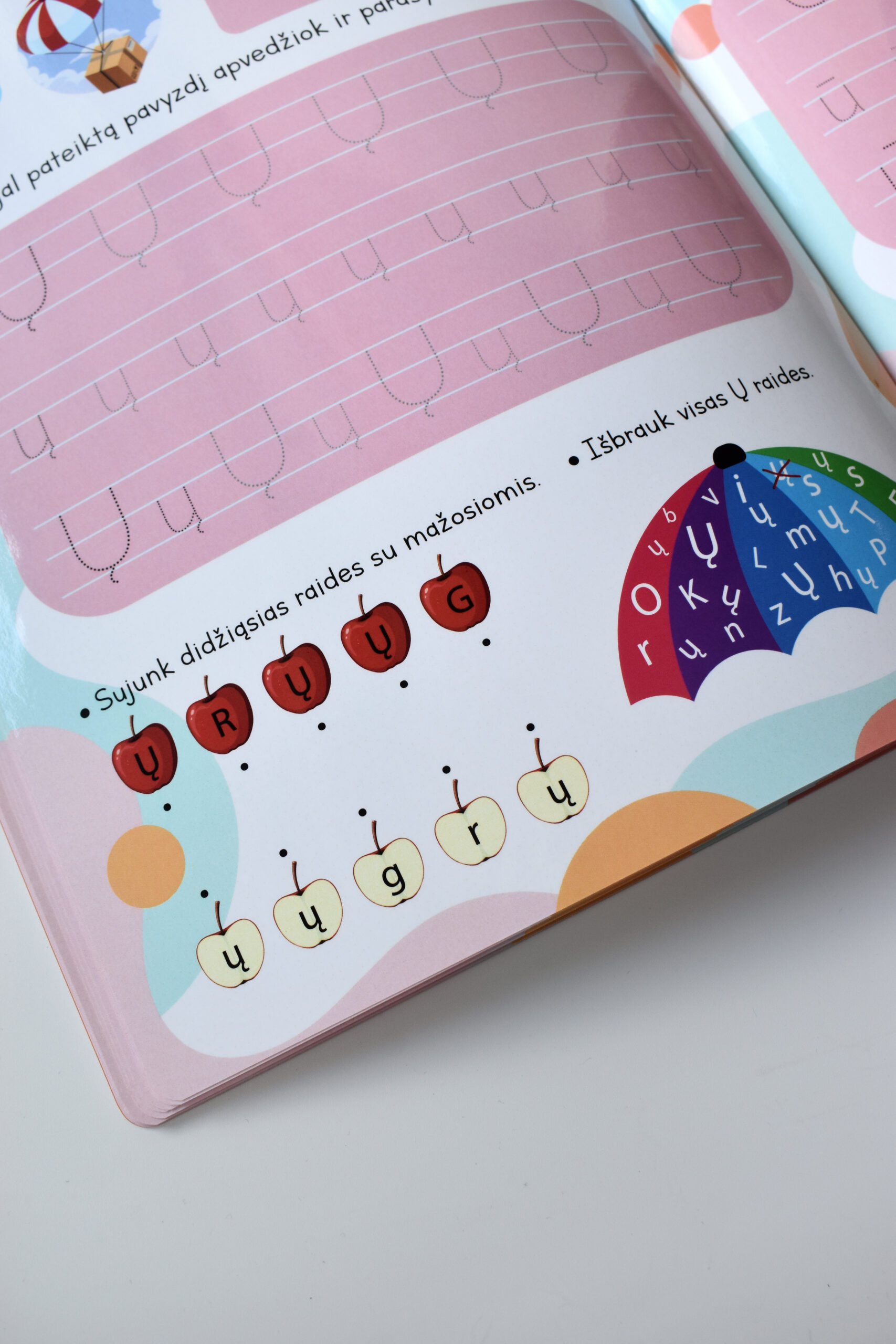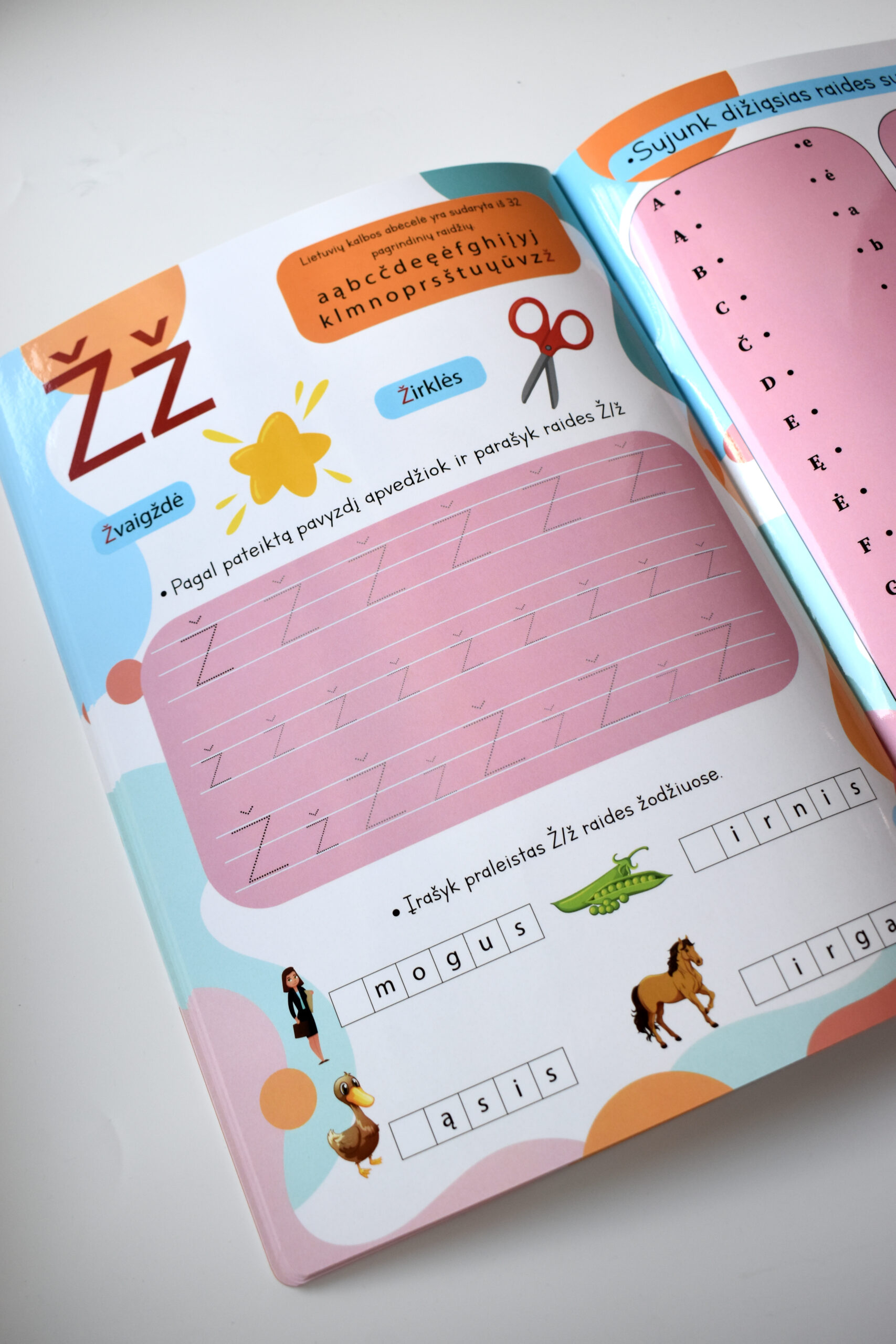 • Visas 32 lietuvių kalbos raides – kiekviena pateikta atskirai su lavinančiomis užduotimis.