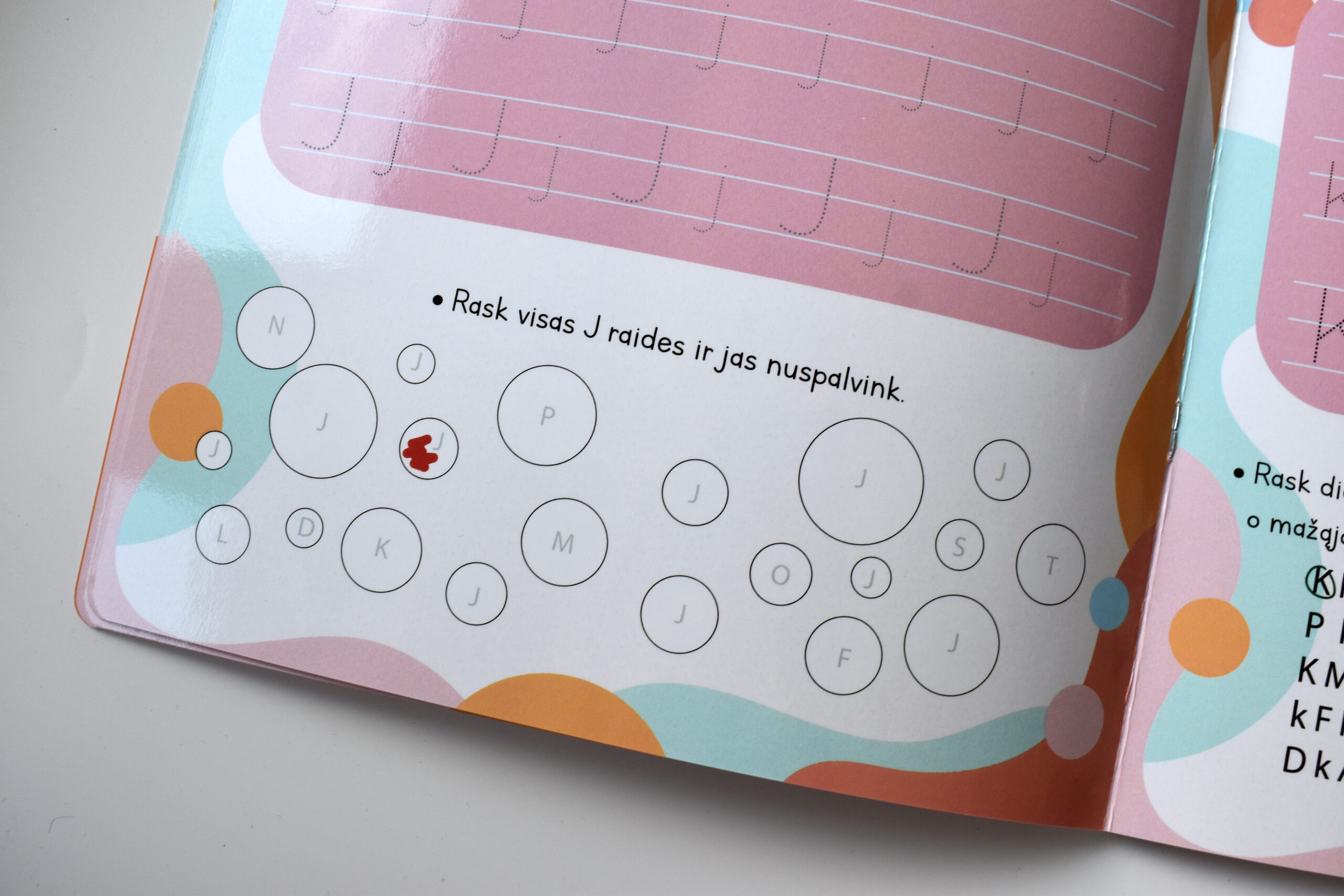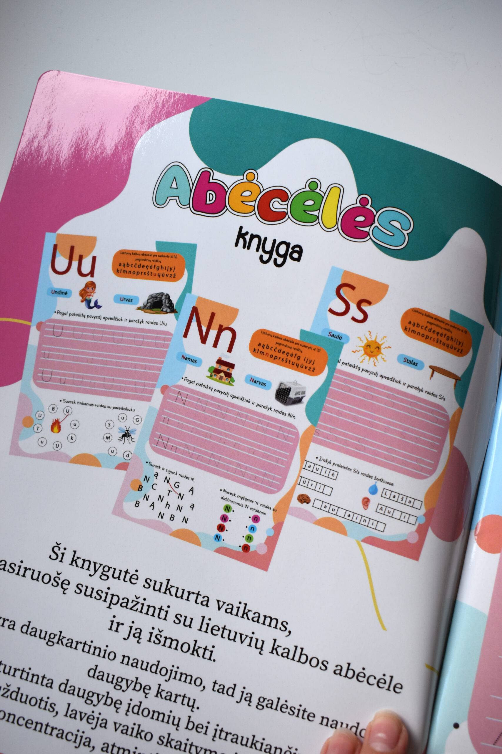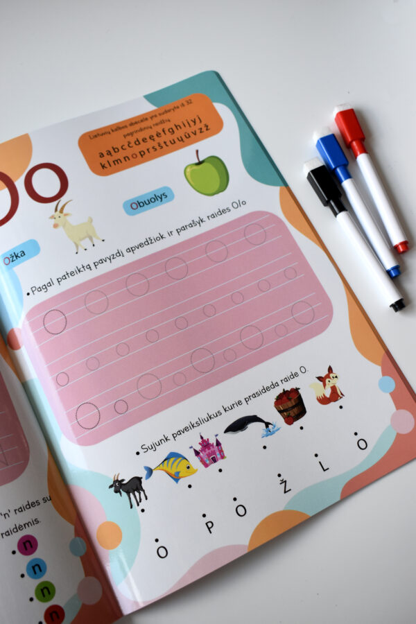 • Visas 32 lietuvių kalbos raides – kiekviena pateikta atskirai su lavinančiomis užduotimis.