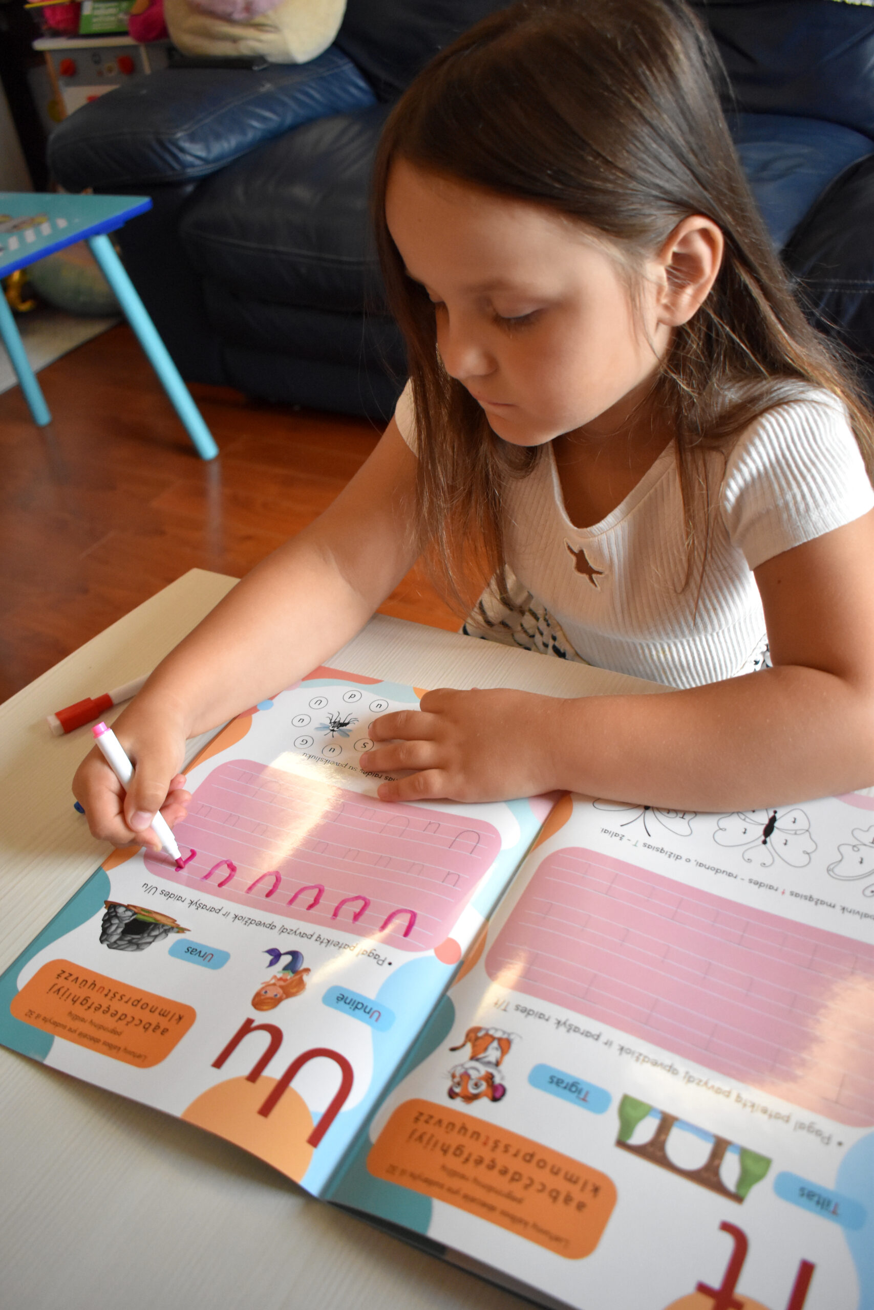 • Daugiau nei 100 skirtingų užduočių – rašymo pratimai, raidžių jungimas, dėmesio, mąstymo bei smulkiosios motorikos lavinimas.
