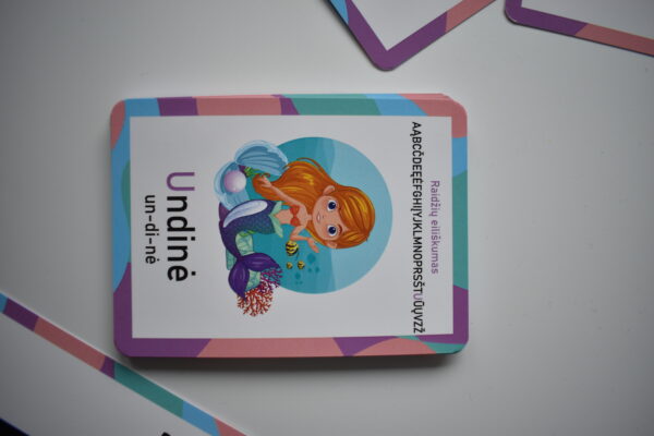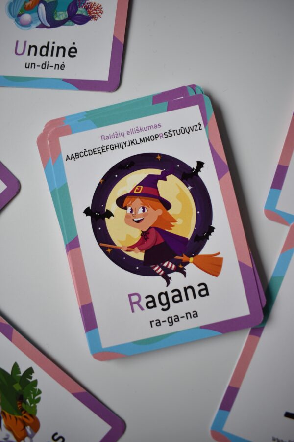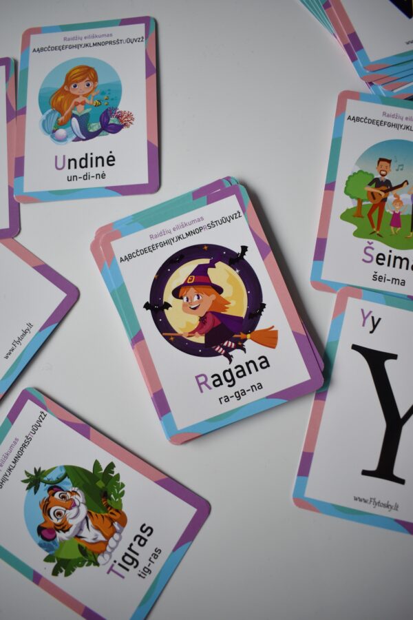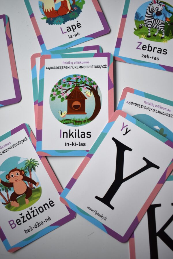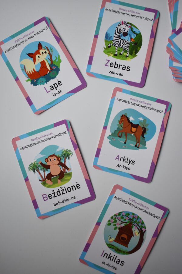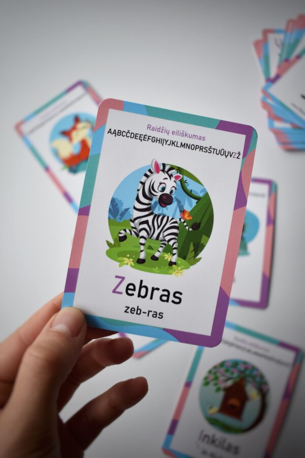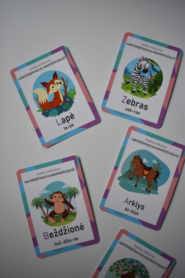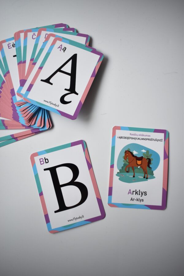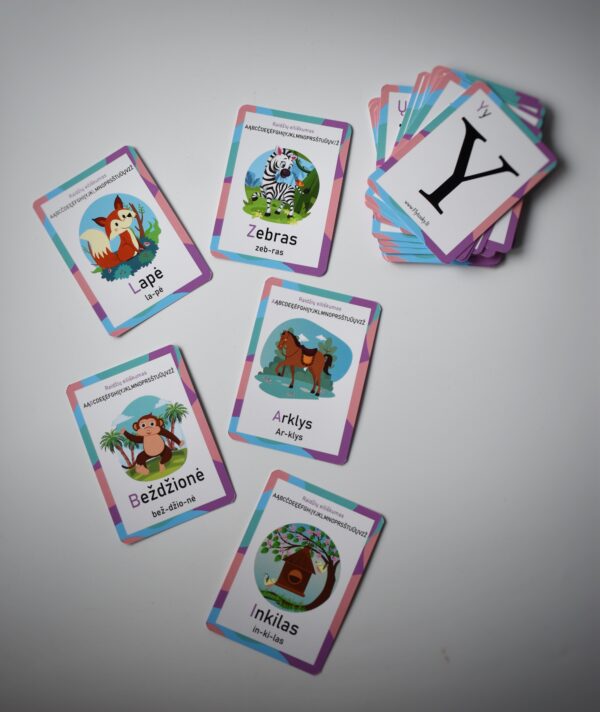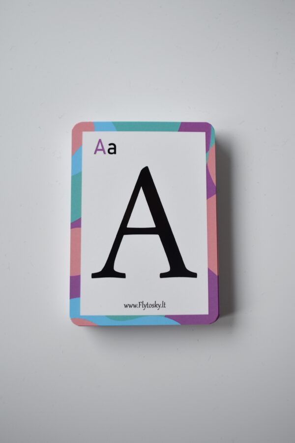 Tai 32 spalvingų kortelių rinkinys, kuriame rasite visas lietuvių kalbos abėcėlės raides, įskaitant ir nosines. Kiekviena kortelė turi ne tik aiškiai matomą raidę, bet ir žaismingą paveikslėlį, kurio pavadinimas prasideda ta pačia raide kaip ir paveiksliuke(pvz. A – arbūzas, B – balionas, Š – šuo ir t. t.). Paveikslėlių pagalba vaikui bus lengviau suprasti ir įsiminti raidę ant kortelės.