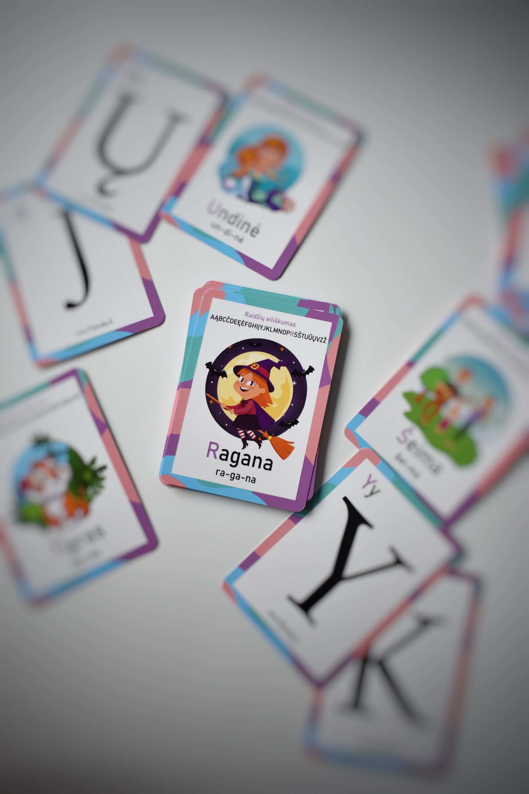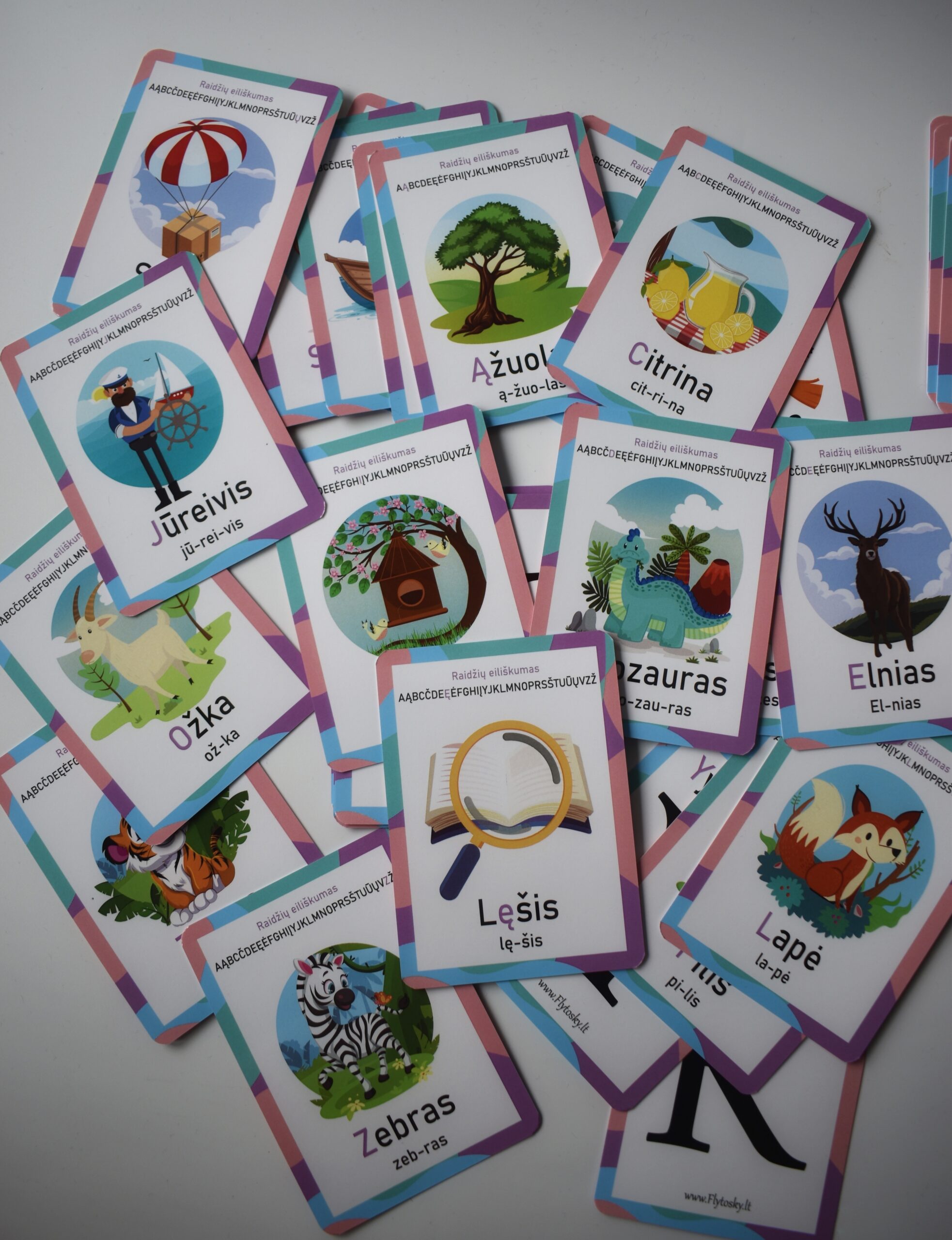 Tai 32 spalvingų kortelių rinkinys, kuriame rasite visas lietuvių kalbos abėcėlės raides, įskaitant ir nosines. Kiekviena kortelė turi ne tik aiškiai matomą raidę, bet ir žaismingą paveikslėlį, kurio pavadinimas prasideda ta pačia raide kaip ir paveiksliuke(pvz. A – arbūzas, B – balionas, Š – šuo ir t. t.). Paveikslėlių pagalba vaikui bus lengviau suprasti ir įsiminti raidę ant kortelės.